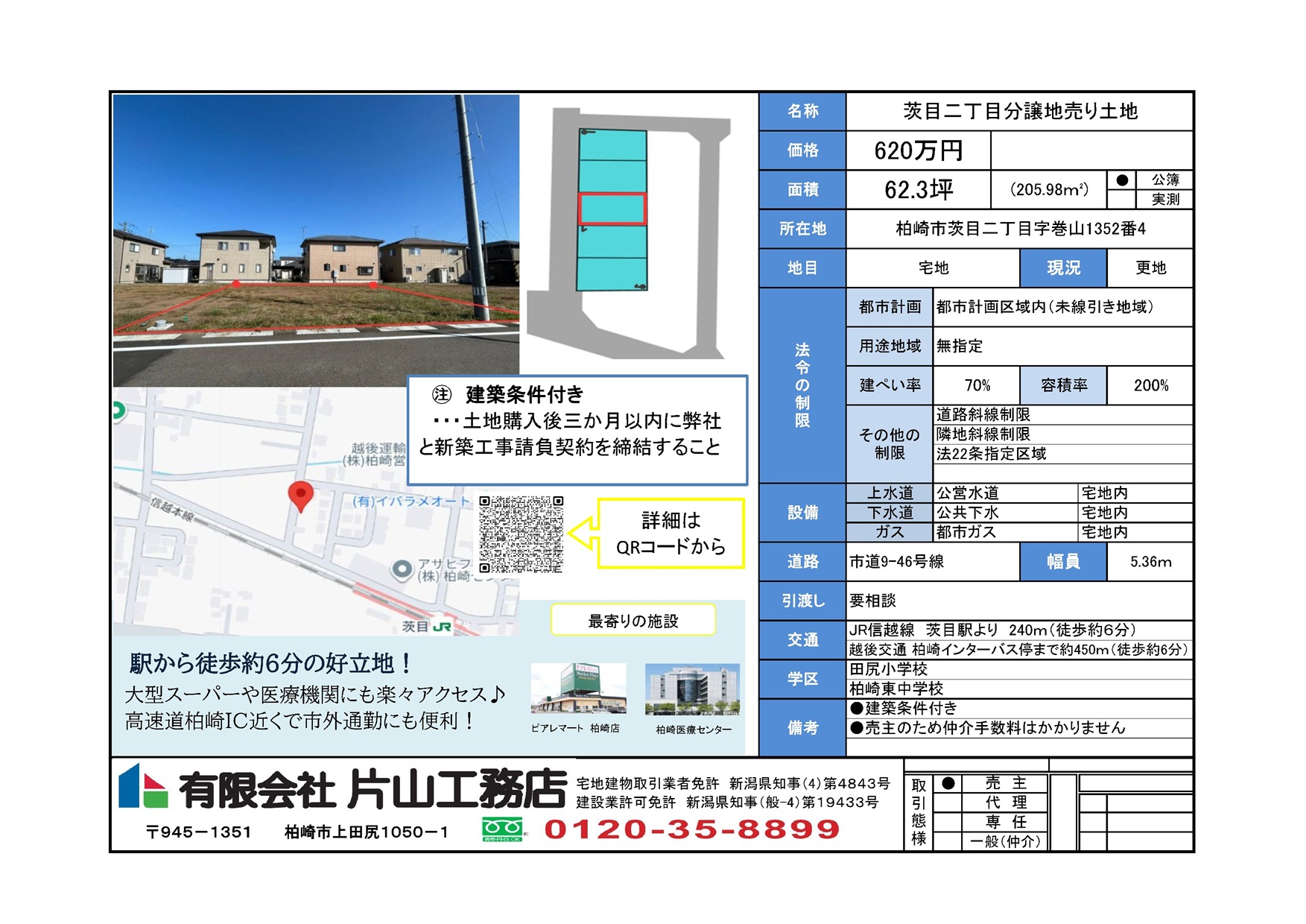 柏崎市茨目二丁目分譲地 物件情報 価格6,200,000円住所新潟県柏崎市茨目二丁目字巻山1352番4アクセス越後交通 柏崎インターバス停まで約450m(徒歩約6分) JR信越線 茨目駅より 240m(徒歩約6分)面積62.3坪(205.98㎡) お問い合わせ 土地・物件名 お名前 フリガナ お電話番号 メールアドレス メッセージ 上記の内容で送信します Δ 前の不動産情報 モデルハウス販売情報 【柏崎市城塚】モデルハウスを販売します! 一覧にもどる