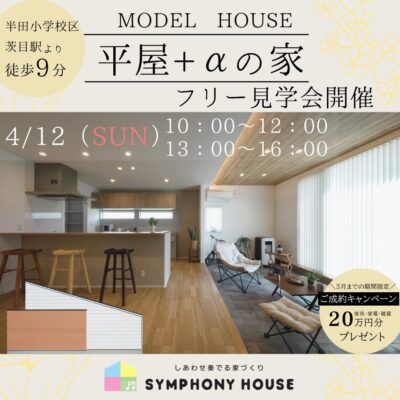 4月12日(日)城塚モデルハウス フリー見学会開催 2026.04.03 ご好評いただいている、 城塚モデルハウス「予約なしで見学できるフリー見学会」 今月は、 4月12日(日) 開催時間:10:00~16:00 ※ご予約いただいた場合は優先的にご案内いたします! 詳細ページへのリンクのご予約フォームからお願いいたします。 ぜひこの機会にお越しくださいませ✨ このフリー見学会の詳しい情報はコチラ 前のおしらせ おしらせ 3月28日(土)構造・現場見学会 開催! 一覧にもどる
