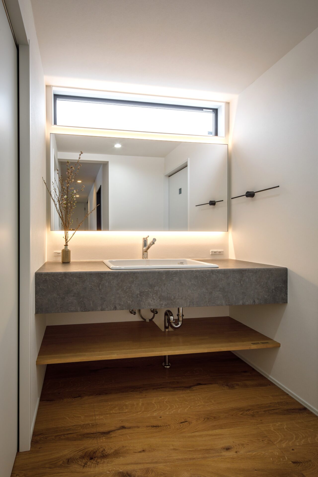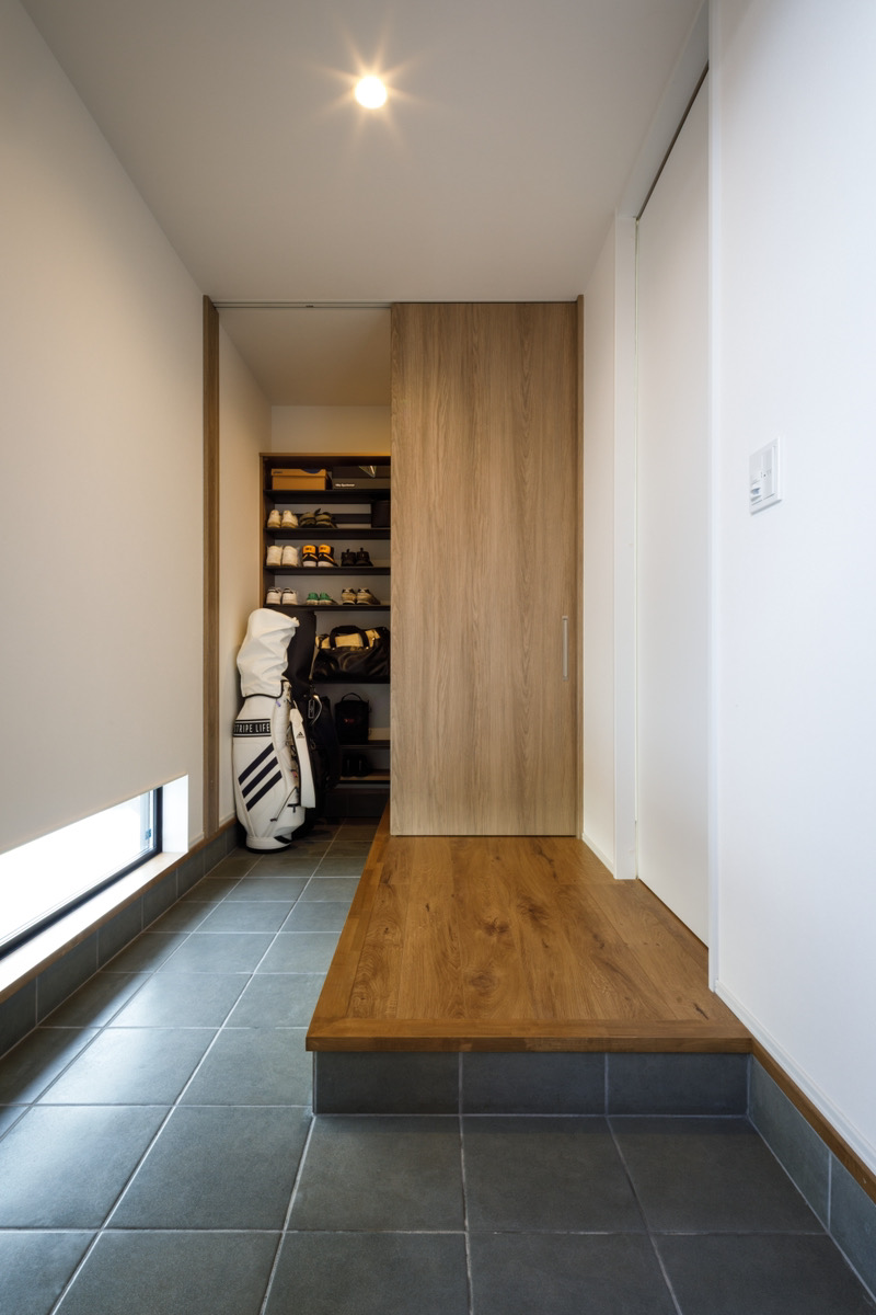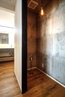 生活感の出やすい脱衣空間を見せることなく、手洗いやトイレを気持ちよく使える動線となっています。加えて、スモーキングルームも完備し、ご夫婦のライフスタイルにしっかり寄り添いました。