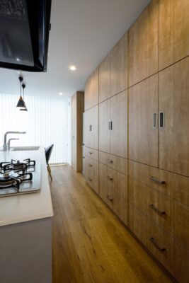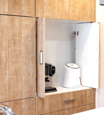 工務店ならではの『キッチン造作壁面収納』も魅力的。扉自体が収納できる設計で、普段は扉を開けっ放しでも扉が邪魔にならず、友達が来た時にはスッキリ収納することができます。天井から床までトータルコーディネートで、スッキリきれいが叶う収納を実現しました。