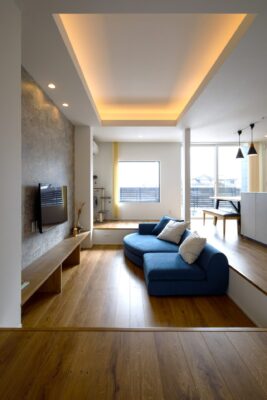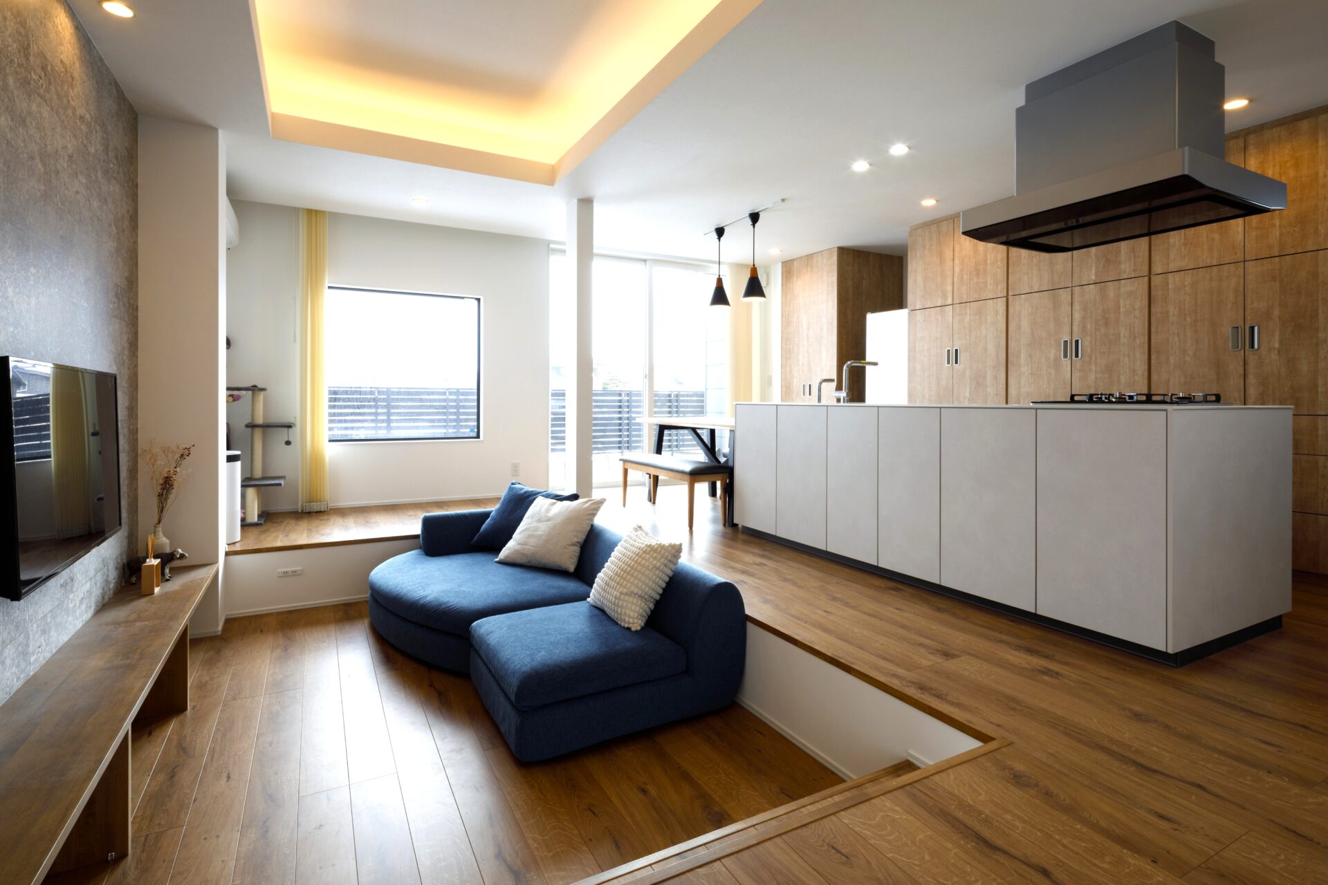LDKの中心には、段差を設けたピットリビングを採用。