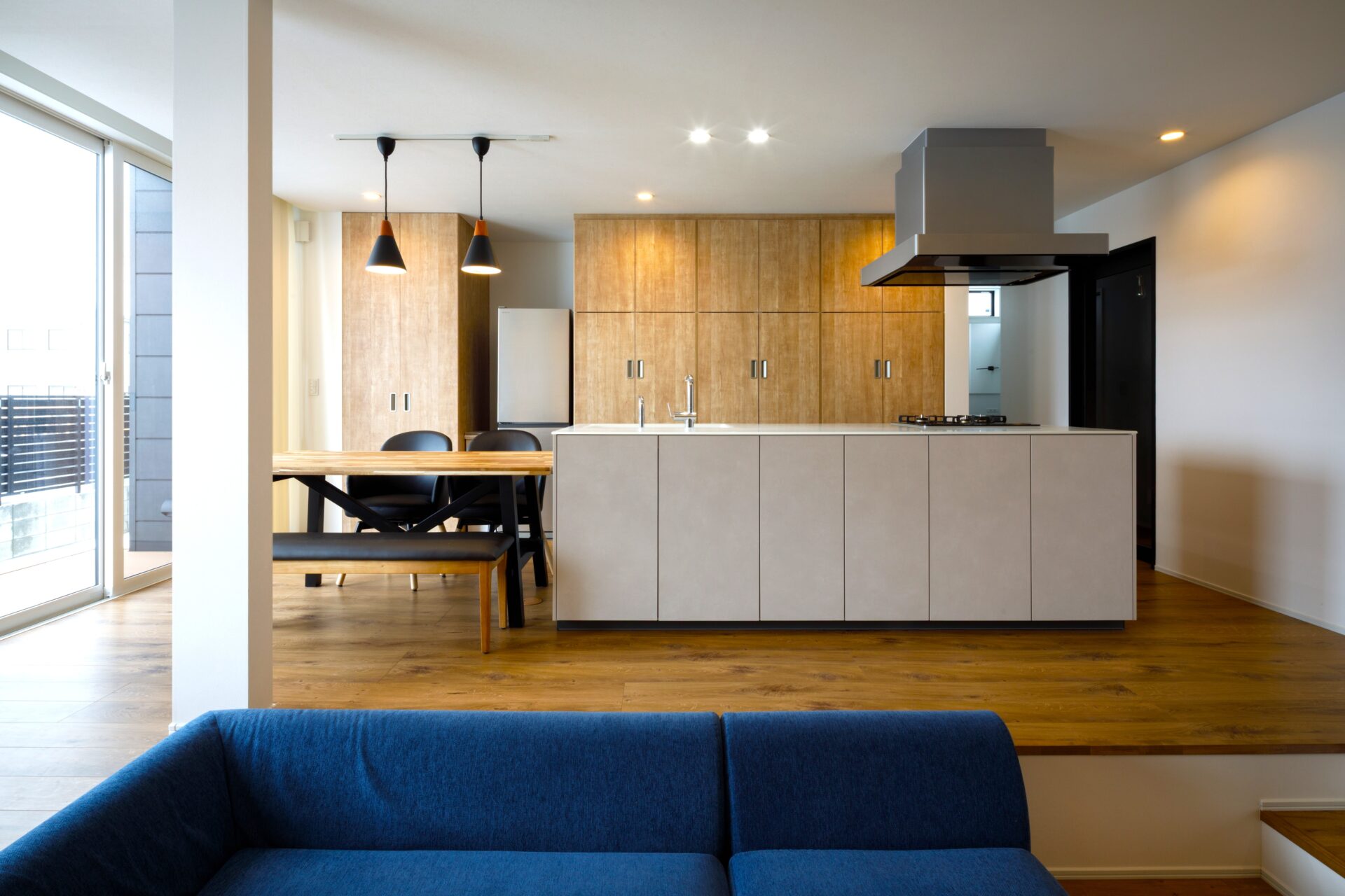 人が集まる家だからこそ、キッチンはクリスタルカウンターのアイランドキッチンに。複数人が同時に立っても動きやすく、空間全体がすっきりと美しく見えるよう工夫しました。キッチン正面には収納も設け、LDKまわりの物をまとめてしまえるのもポイントです。