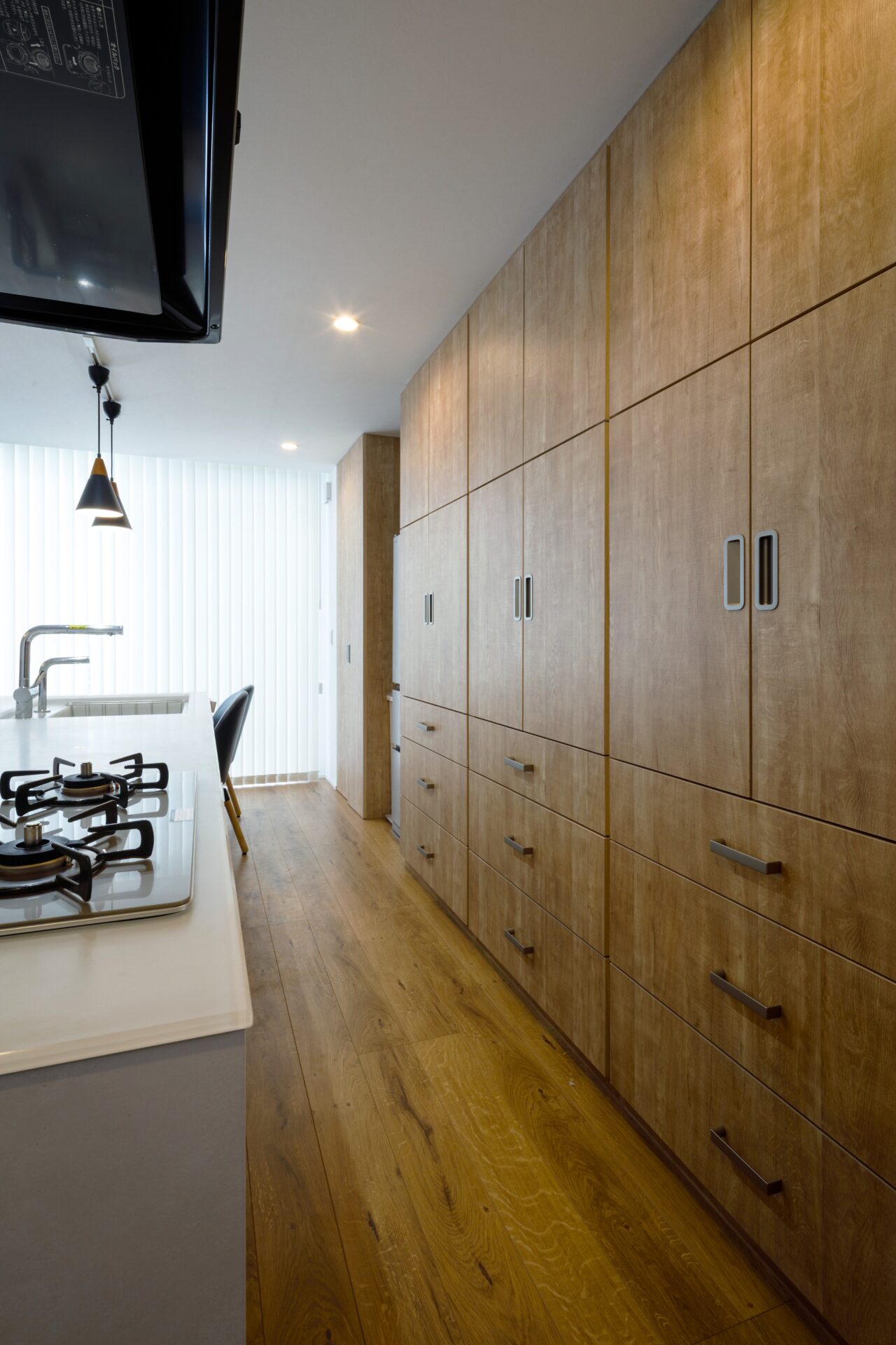 テレビ面のカウンター下は、カゴなどを使って見せずに収納できるため、生活感を抑えながら、整ったリビングを保てます。窓際には植物やペットのおうちを置けるスペースを確保し、カーテンボックスや縦型ブラインドを採用することで、細部まで「すっきり」を意識した空間に仕上げました。